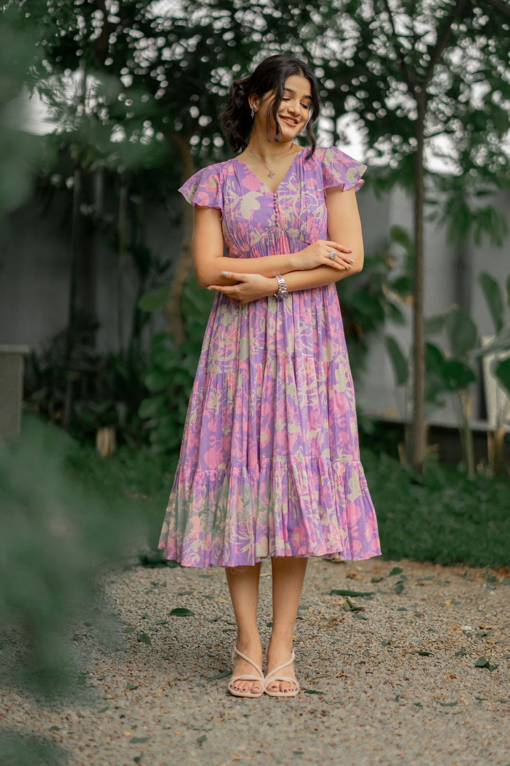 Playful yet elegant, this lilac pink georgette dress features a soft abstract floral print in pastel hues. Designed with a flattering V-neckline and flutter sleeves, it adds a feminine charm. The tiered, mid-calf length silhouette flows gracefully, making it perfect for brunches, casual gatherings, or a breezy day out. Pair it with delicate jewelry and strappy sandals for a chic and effortless look.