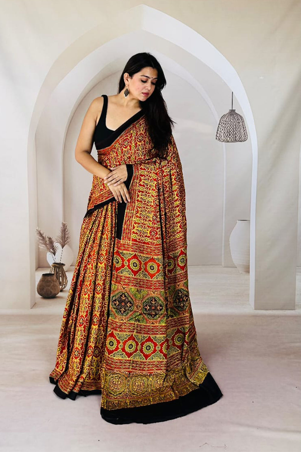 Bring vibrance and heritage together with this yellow modal silk saree, highlighted by a classic red Ajrakh design that adds depth and traditional charm. The contrast of warm yellow with rich red creates a striking balance, making it perfect for festive and cultural occasions. Crafted in luxurious modal silk, the saree drapes gracefully with a soft, lightweight feel.