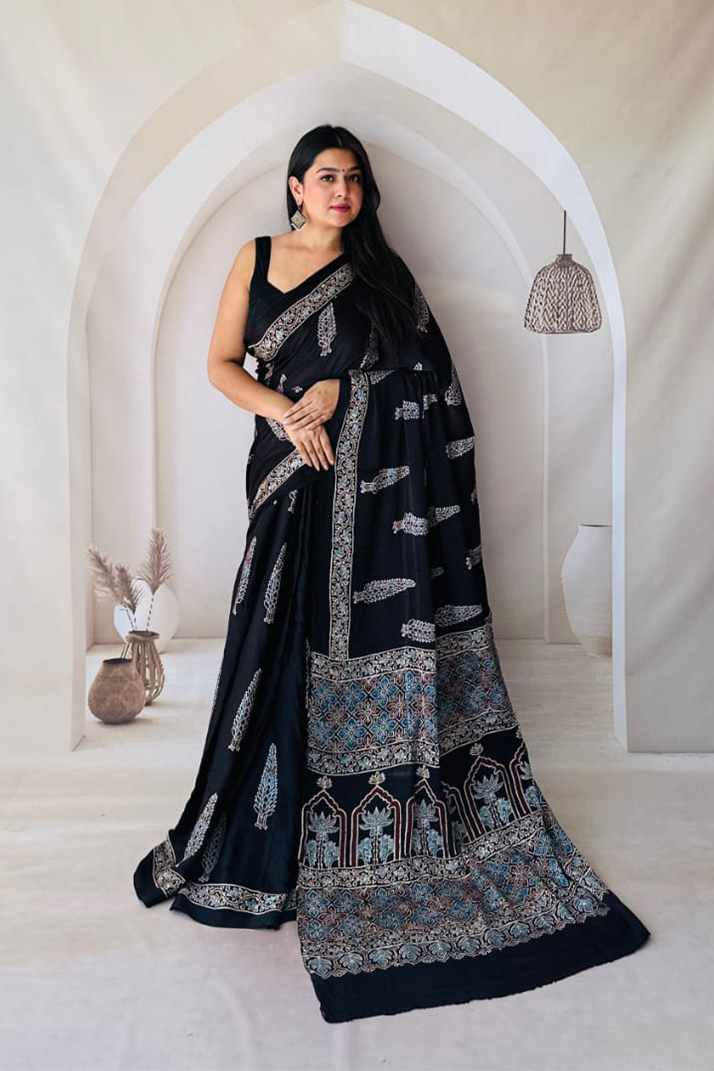 Elegant black modal silk saree with paisley motifs, Ajrakh-inspired pallu & printed blouse piece.