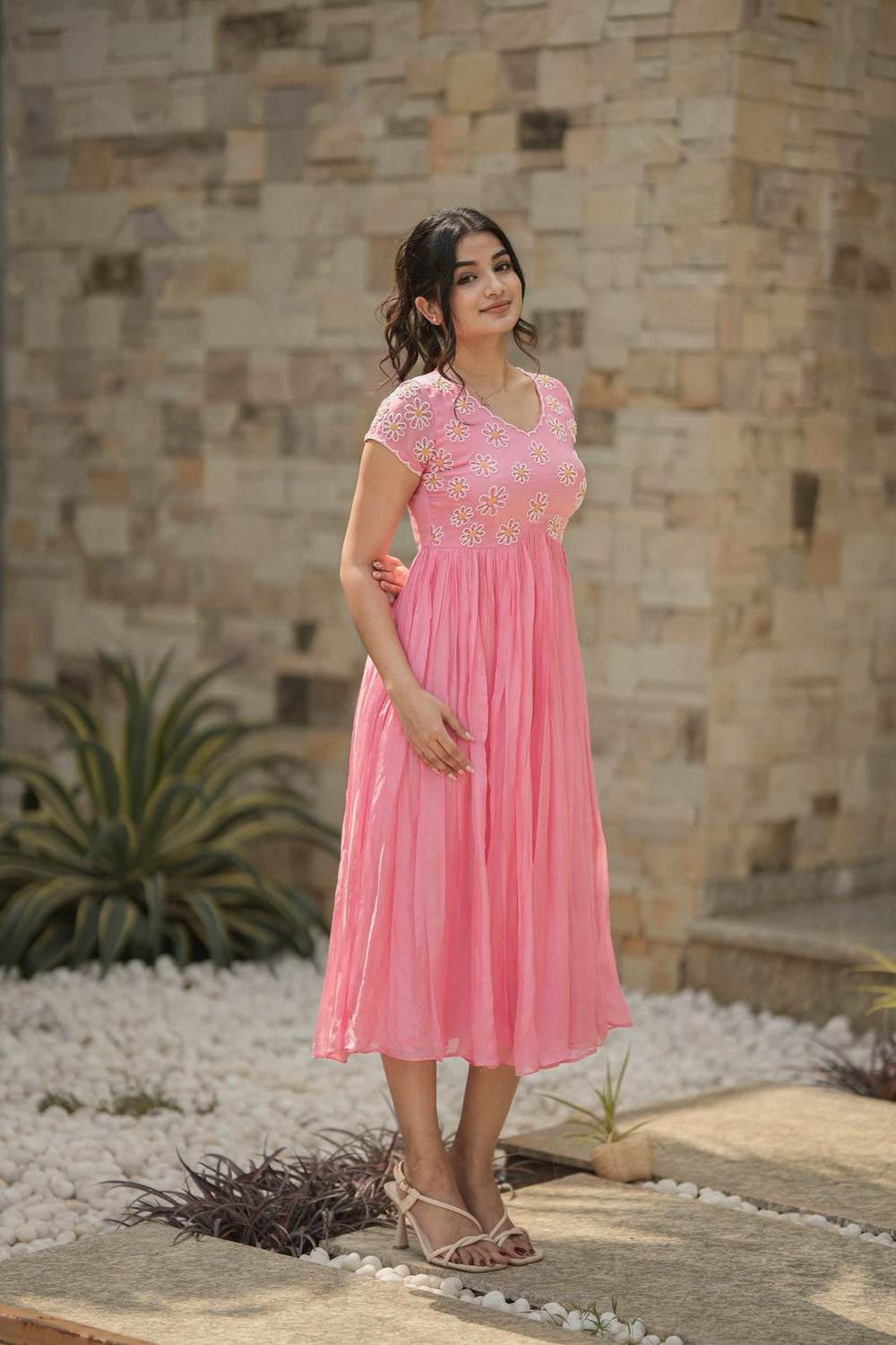 Fresh, feminine, and flowy – this blush pink georgette dress is designed for effortless elegance. The bodice features delicate white daisy floral embroidery, paired with a flattering V-neckline and short sleeves. The gathered, mid-calf length skirt flows beautifully, creating a breezy and graceful silhouette. Perfect for brunches, garden parties, or casual festive wear, this dress brings out a soft and playful charm.